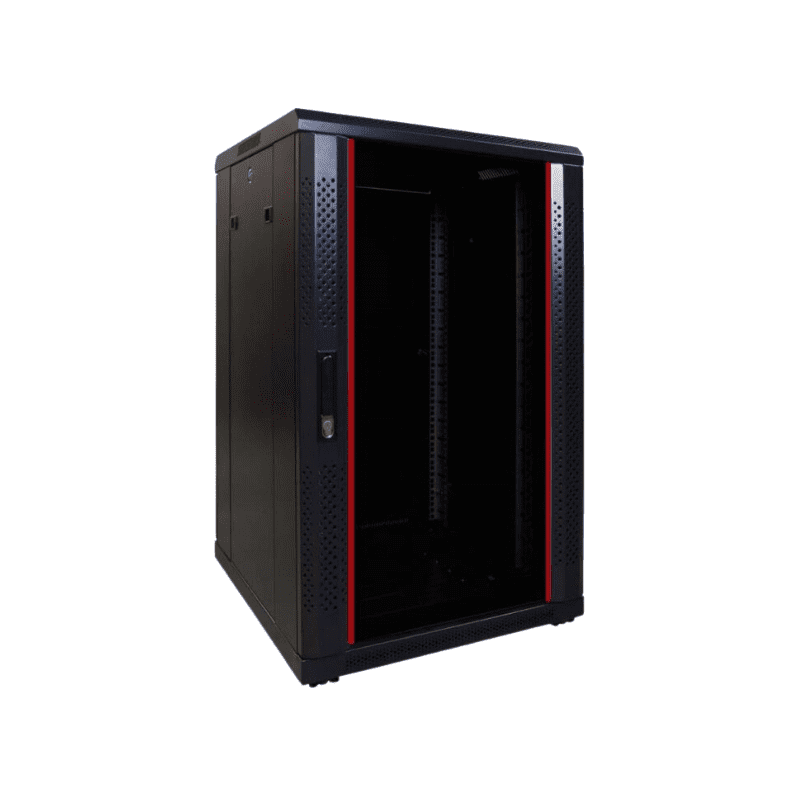 Coffret mural 19” avec porte avant vitrée et panneau arrière plein. Les montants 19” sont réglables en profondeur et les panneaux latéraux sont amovibles.