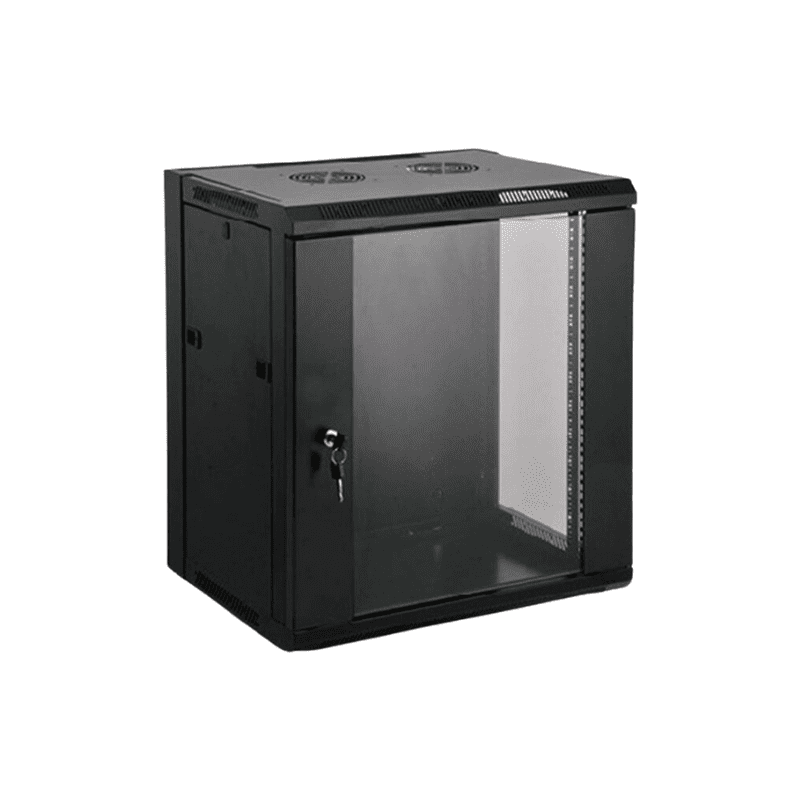 Coffret mural 19″ avec porte avant vitrée et panneau arrière plein. Les montants 19″ sont réglables en profondeur et les panneaux latéraux sont amovibles.